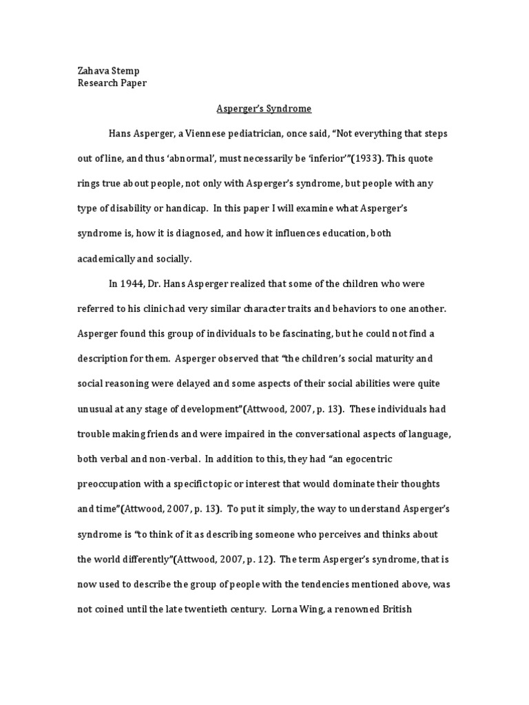 Further, the research paper provided practical information for the teachers “in the trenches,” as they worked diligently to meet the needs of students with Asperger's Syndrome. Based on the belief that teachers play a vital role in helping students with AS relate effectively to the world around them, the guide for teachers was developed to fill the gap between research and practice Research Paper On Asperger Syndrome. Asperger Syndrome (AS) is a one of five autistic spectrum disorders. AS is also recognized by some as a neurological disorder. Sufferers of this syndrome share many of the same characteristics of autism except the accompanying disabilities In this paper, behavior, motor skills and language capabilities of individuals with Asperger are compared to those in healthy controls. In addition, common findings across MRI and fMRI based studies associated with behavior and cognitive disabilities are blogger.com by: 9